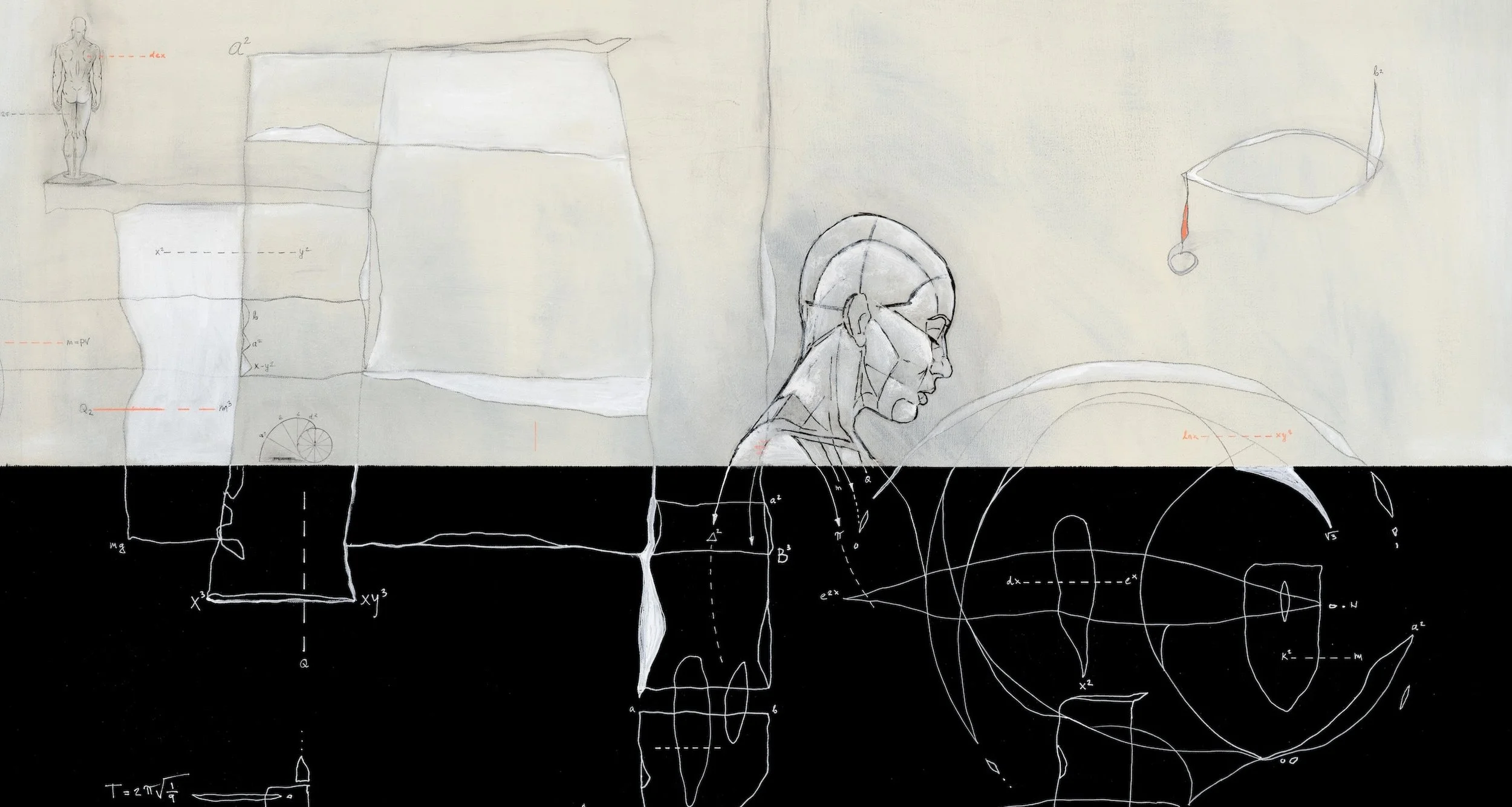 Resembling both a jumbled mathematical equation and engineering schema, the works can be seen as blueprints of the world's DNA, filled with ancient human-made forms, anatomical drawings of the human body in different positions, and geometrical structures, all extracted from our material and immaterial reality.